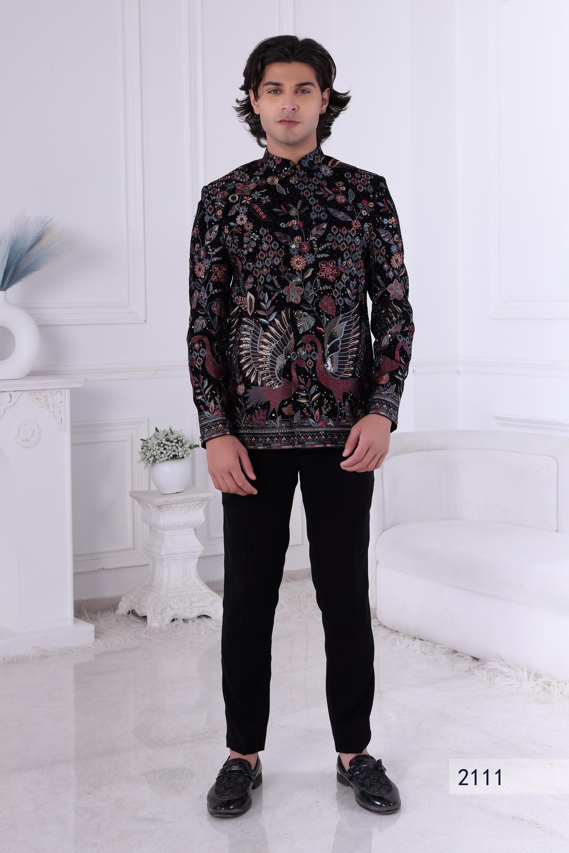 Black Embroidered Sherwani for Men – Regal Floral & Bird Design Indian Wedding Outfit Custom Tailored