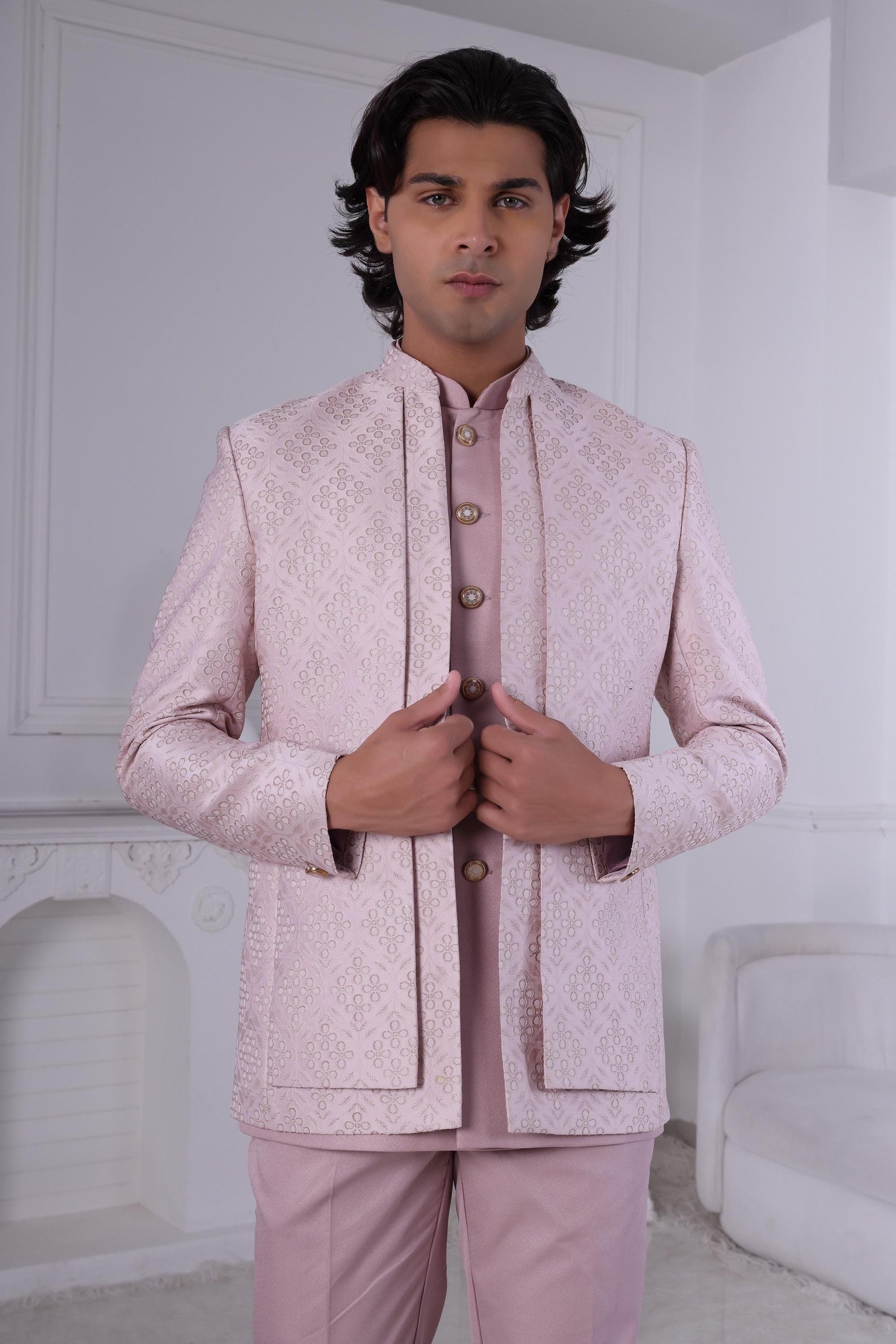 Blush Pink Embroidered Sherwani: Indo-Western Groom Wedding Outfit