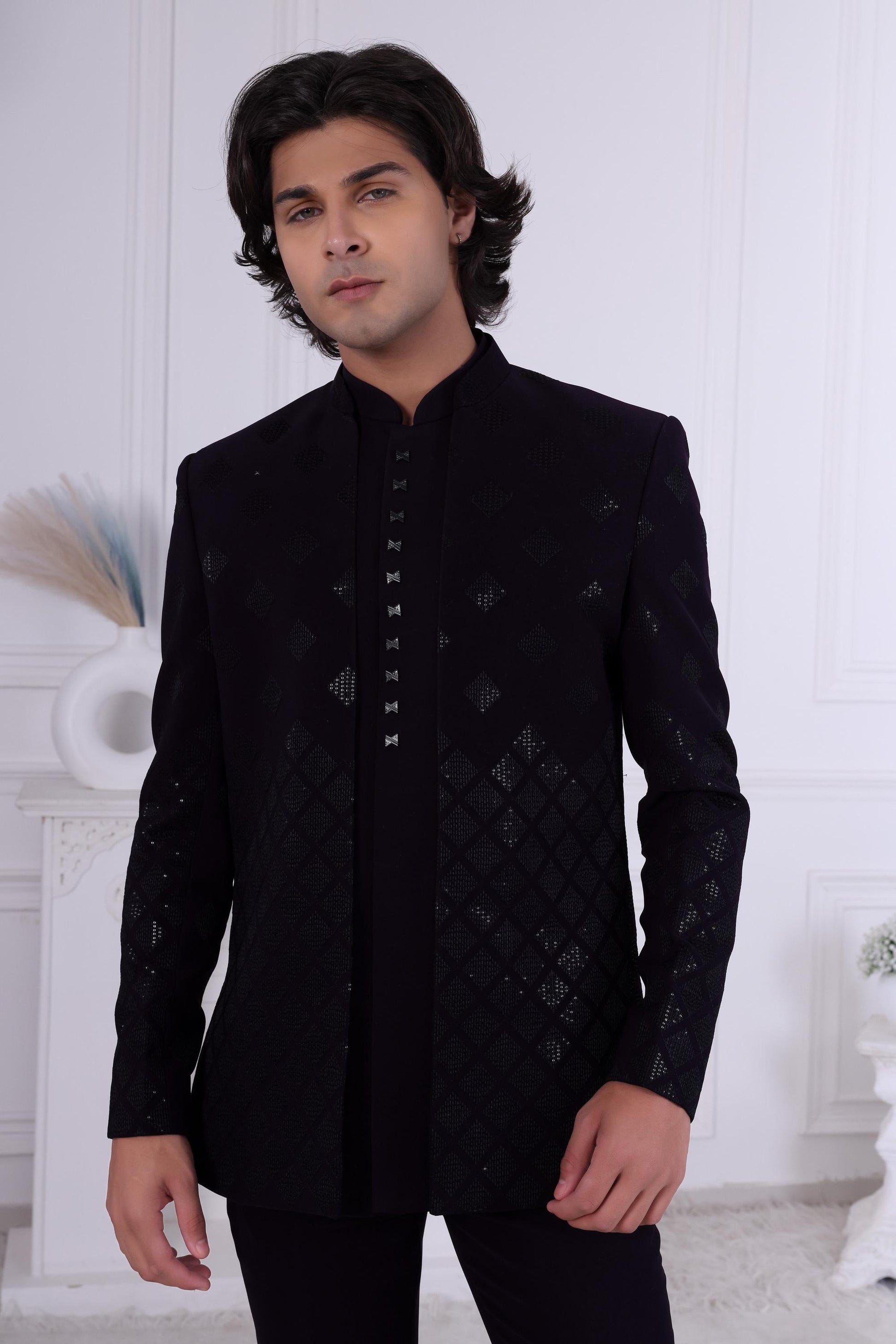 Men's Black-on-Black Sherwani with Cascading Diamond Pattern | Indo Western For Indian Wedding | Jodhpuri Suit